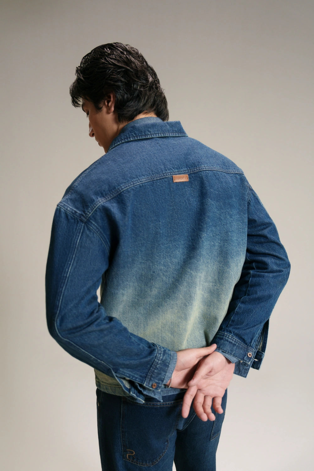 The Denim Shacket is a bold reimagining of a classic workwear staple. Defined by its distinctive gradient wash, it transitions from rich dark indigo to sun-faded light blue, creating a dynamic visual statement. The boxy, slightly cropped silhouette delivers a contemporary edge, while heavyweight denim construction ensures long-lasting durability. Finished with premium copper-toned buttons and reinforced stitching, this shacket is a versatile layering piece designed to add artisanal texture to any street-style rotation.