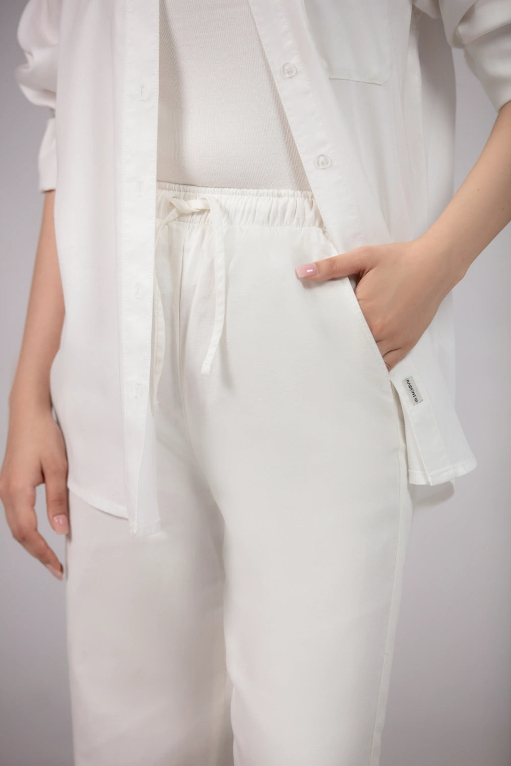 Regular fit trousers for women, crafted from a breathable cotton and linen blend. Designed with an adjustable drawstring waist and front pockets, they offer comfort with ease. The airy weave and slight flare make them an ideal choice for everyday casual hangouts