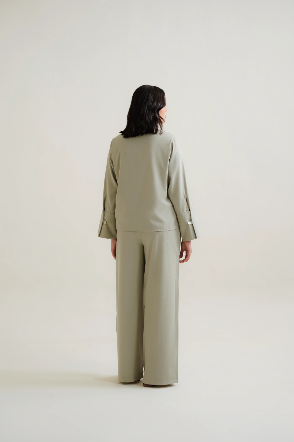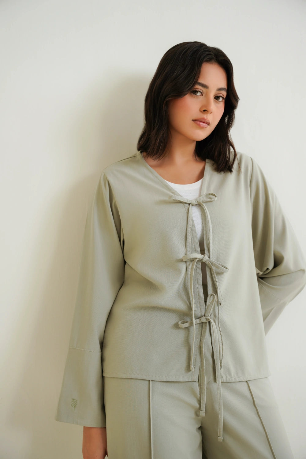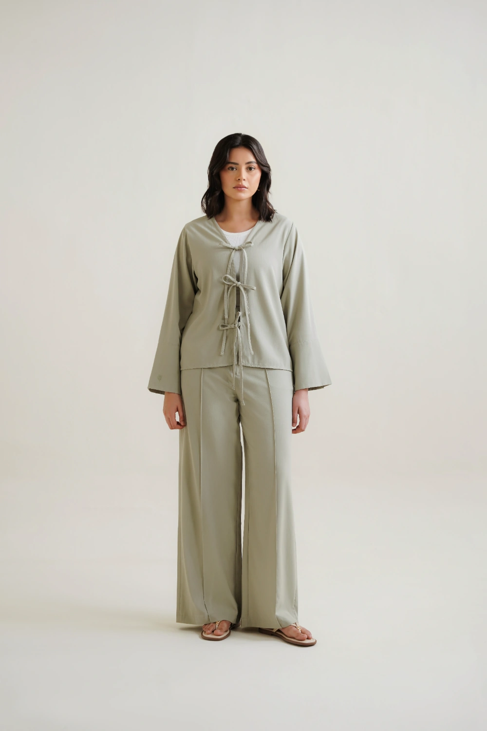 Experience the perfect balance of serenity and structure. This set features a kimono-inspired top with a deep V-neckline and delicate front-tie closures that offer versatile layering opportunities. The sleeves are intentionally wide and lined, allowing you to fold and cuff them to your desired length for a personalized touch. Accompanied by matching tailored wide-leg pants with a pintuck and an elasticated back, this co-ord creates a continuous, elongating line in a soothing light mint hue. The high-performance rayon blend ensures the fabric feels cool against the skin while resisting the creases of a busy day.
