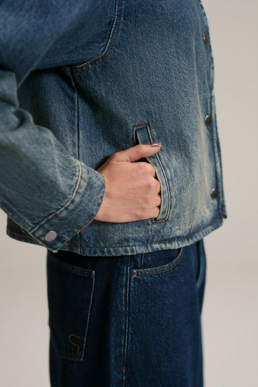 The Regular Fit Shacket is a directional take on modern denim outerwear, redefining traditional silhouettes through minimalist design. Stripped of the classic collar, its clean round neck and boxy, cropped proportions create a contemporary, architectural aesthetic. The standout artisanal ombré wash delivers a striking visual fade from deep indigo to weathered light tones. Finished with premium gunmetal hardware and discreet side-entry pockets, this lightweight layer is built for versatility, refined texture, and everyday wear.