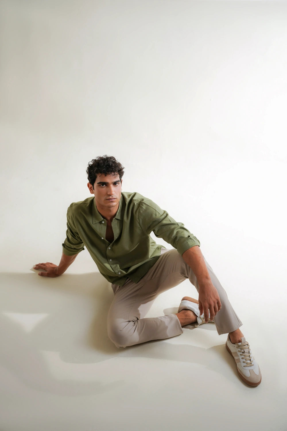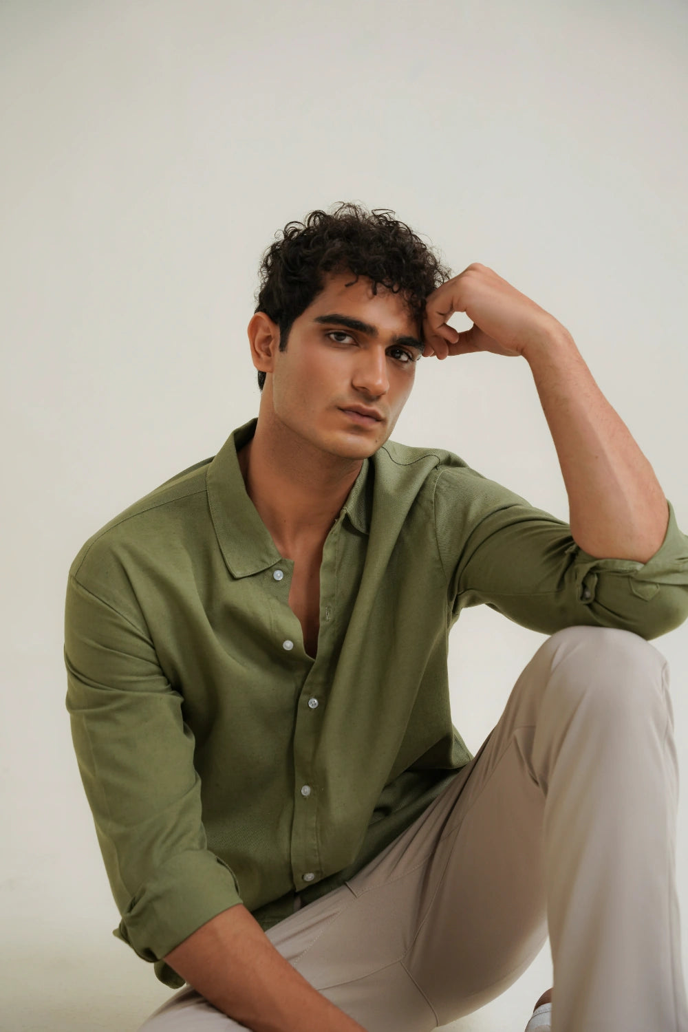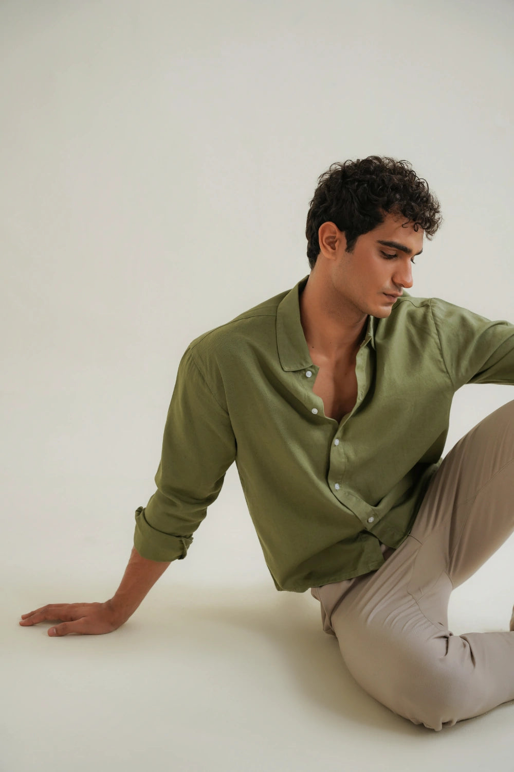 Meet the shirt that works as hard as you do. Our Safari Button-Down features a timeless olive hue and a sophisticated finish, making it a versatile cornerstone for any wardrobe. The silhouette is tailored for a clean, regular fit that provides enough room for layering without sacrificing a sharp profile. Whether you're navigating the city or escaping for the weekend, the unique Cotton-Tencel-Linen fabrication ensures you remain crisp and composed. Finished with a classic pointed collar and buttoned cuffs, it’s the perfect blend of utility and elegance.