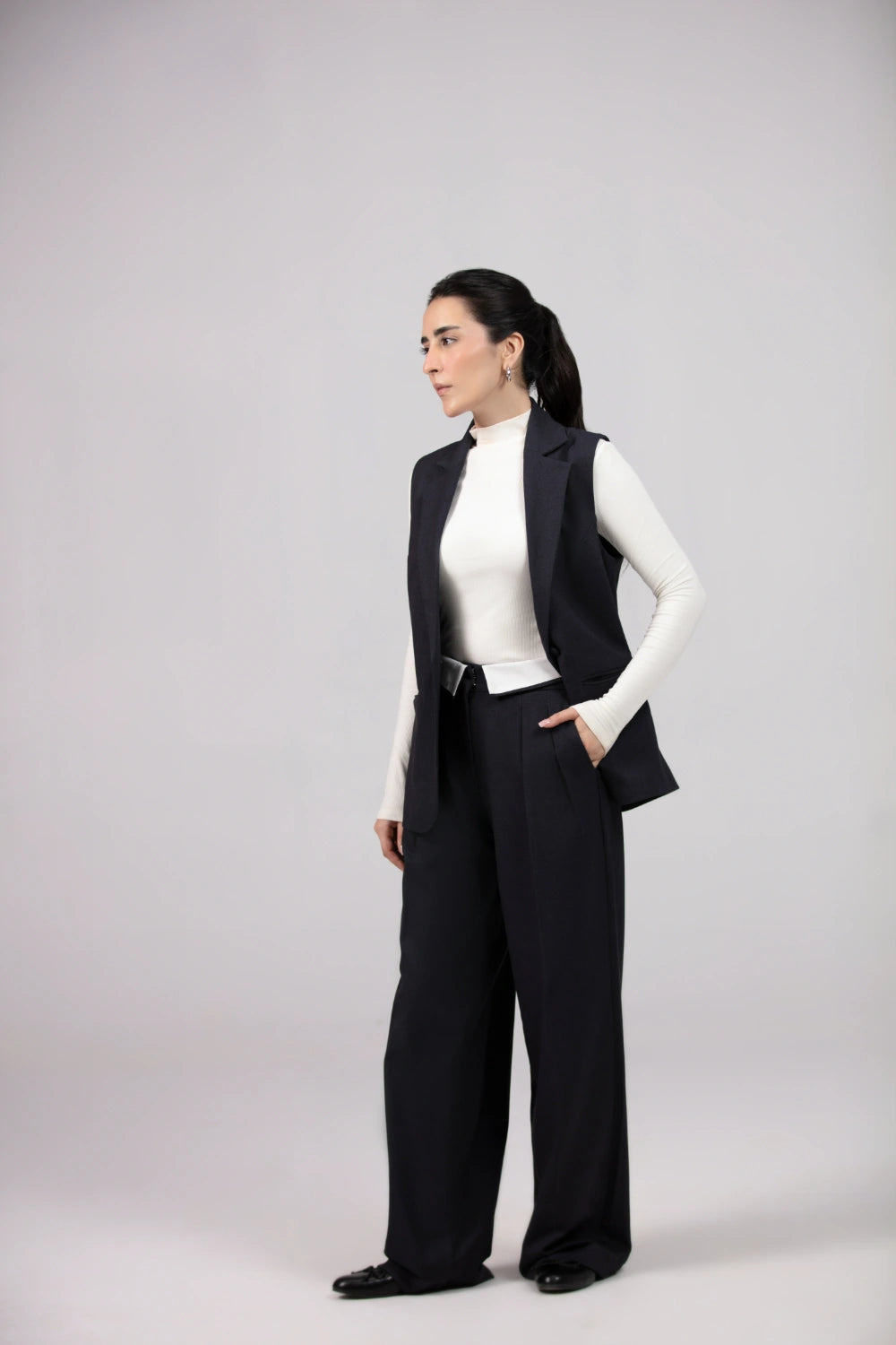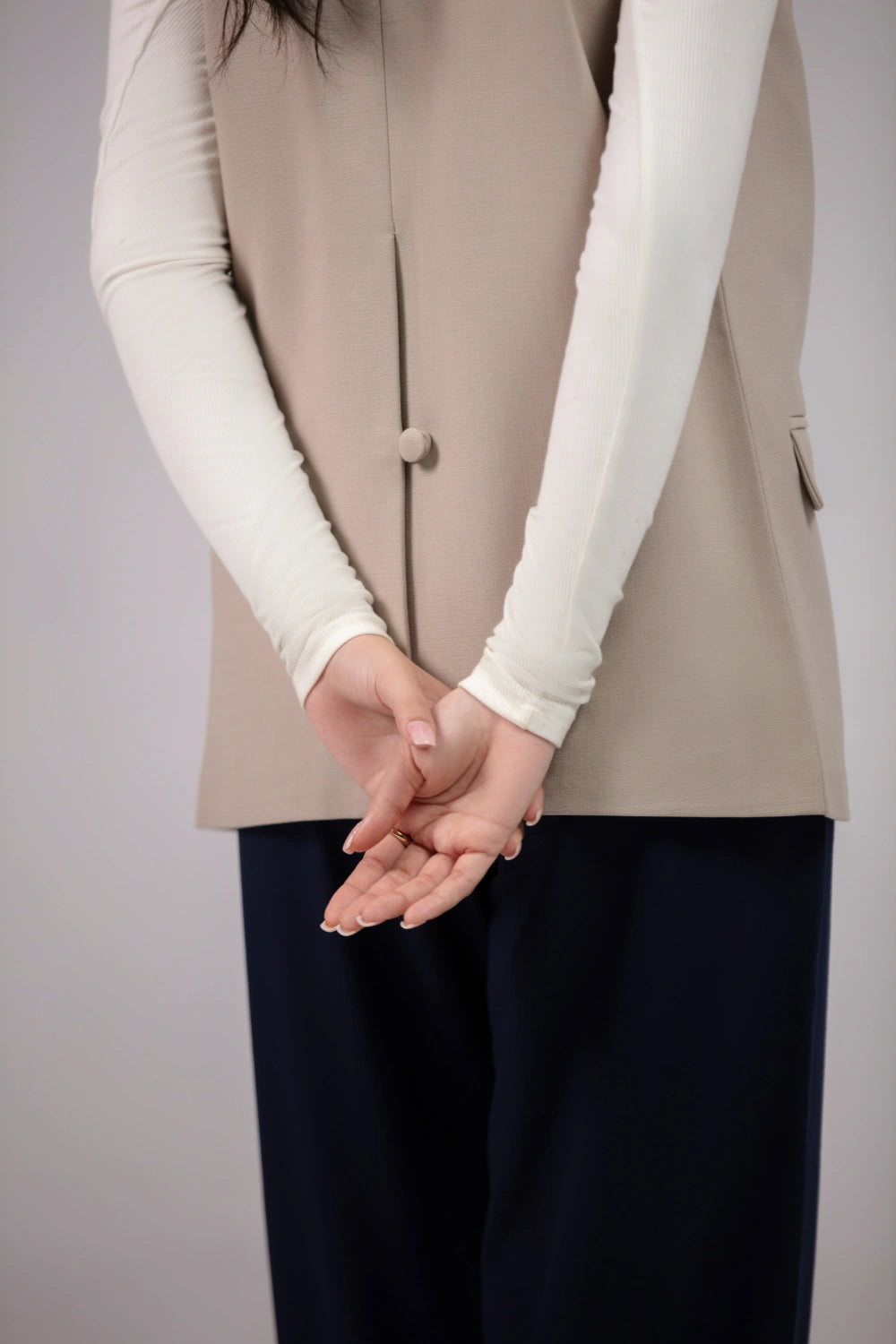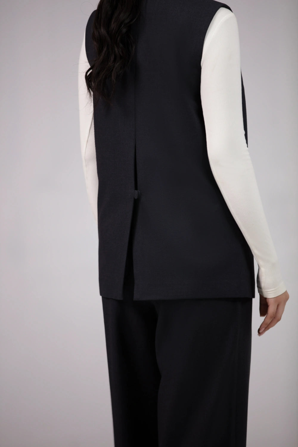 This women’s sleeveless blazer features a relaxed fit, perfect for effortless layering. It’s designed with a notch collar and back slit for ease of movement and a fluid drape. The sleeveless cut adds versatility, while convertible welt and flap pockets balance style with function.